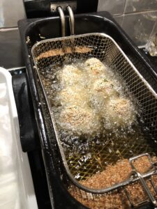 Form fine kuler, rulles i sesamfrø og frityrstekes i varm olje, ca 4 minutter på 185 ℃.