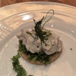Hakk tarmgrønske og ruccolasalat og bland det i en annen bolle Fordel salatblandingen på kjeksene
